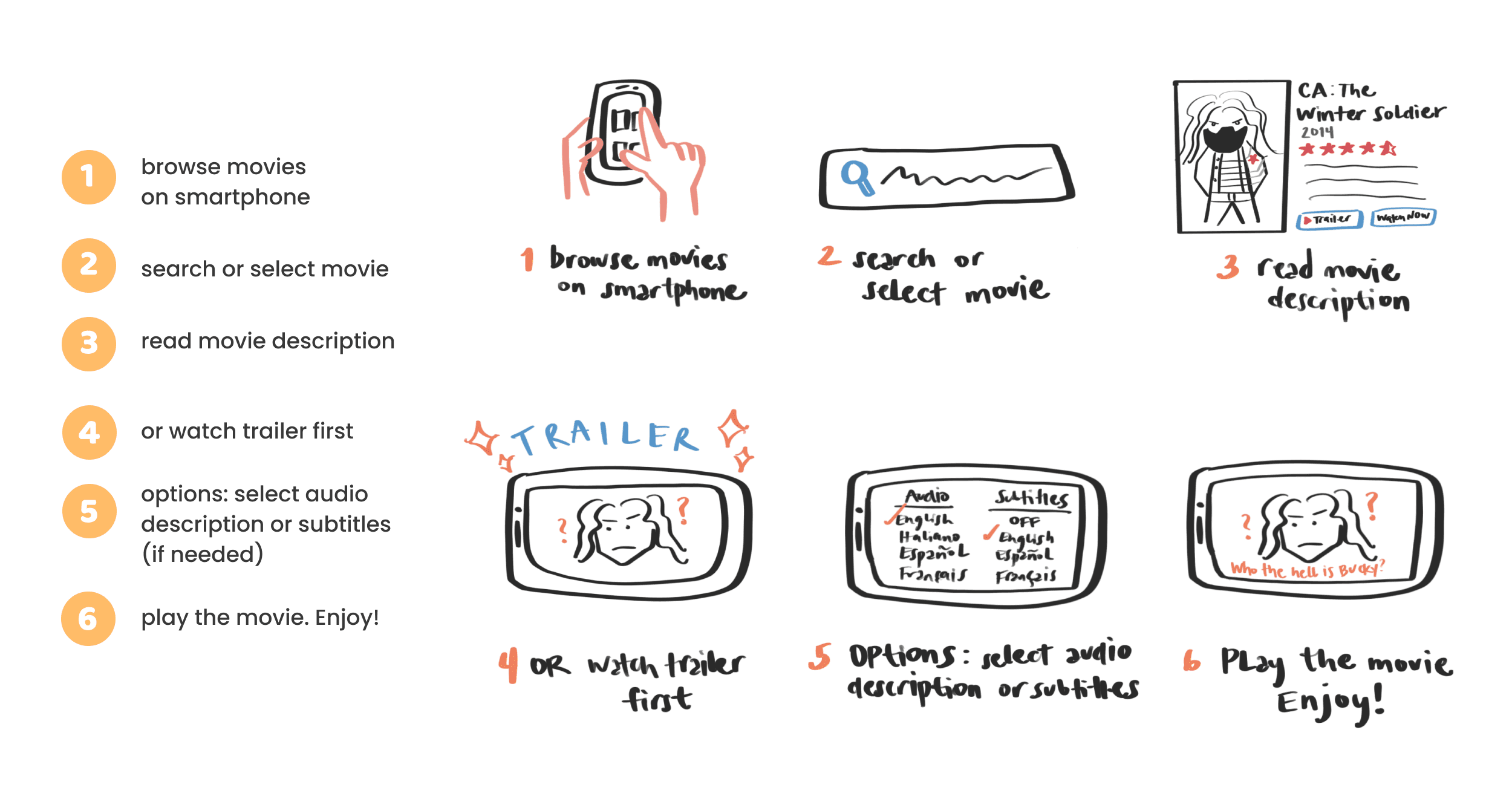 Having to create a comprehensive flow for the majority was challenging especially to those who are not US based. In reality, budget and the demand for a movie to be subtitled, dubbed, and/or have audio description is required to include that option. Similarly to Netflix and Amazon Prime, this will most likely be a subscription app as well. If any subtitles or audio description are missing, I provided an option for the user report anything that seems amiss to them in order to further improve the app and cater to their needs.