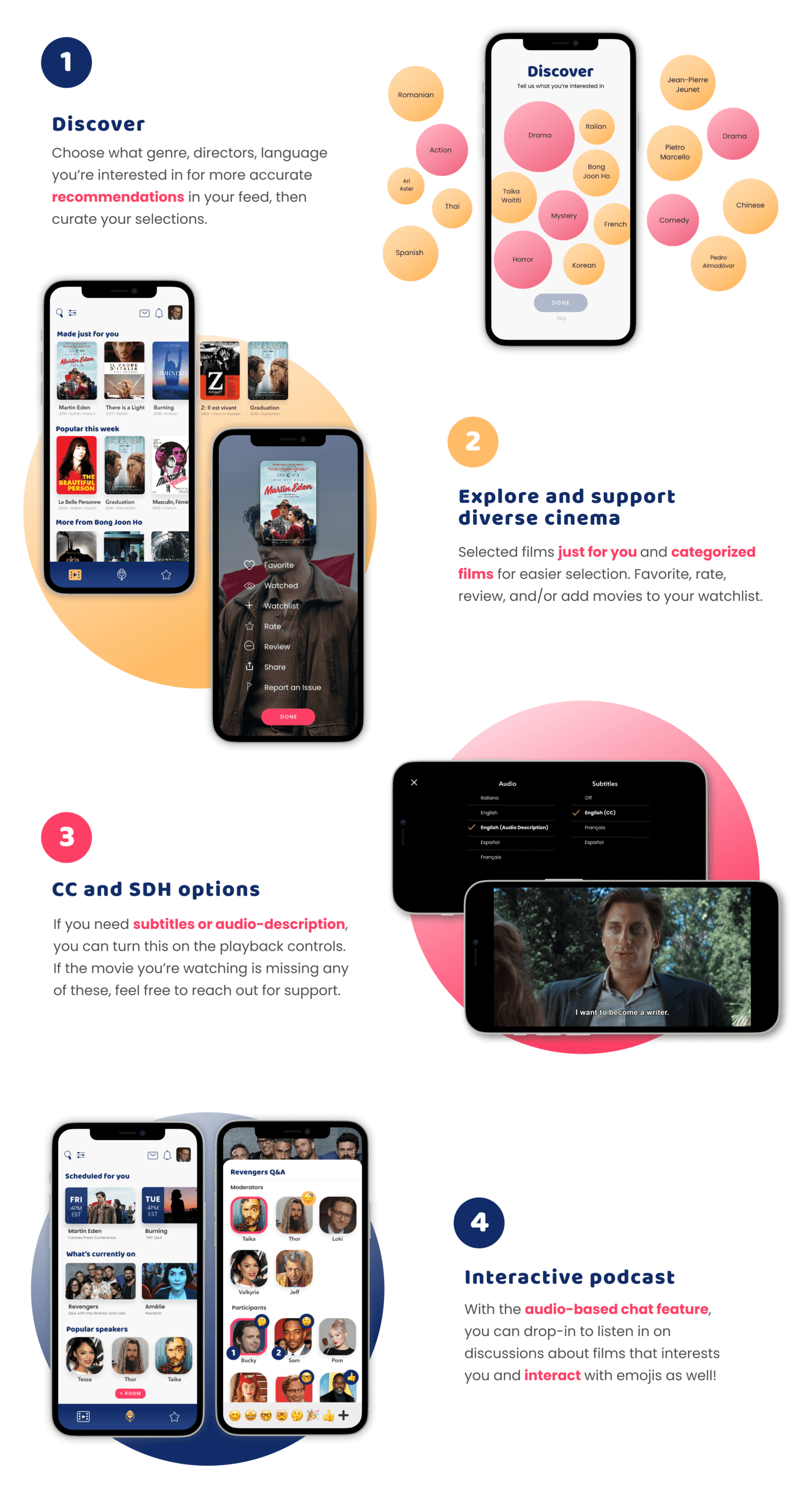 Personally, I enjoy learning about other cultures and different languages through movies, which is what mainly inspired to me to highlight international and foreign-language films for this app concept. I can see how dubbing is beneficial, but the downside to it is that it can significantly change a story. But in the end of the day, it’s all about preferences and making cinema accessible for everyone despite their age, gender, race, ethnicity, sexual orientation, disability, and religion. Sometimes, it’s good to push boundaries and try new things to improve user experience.