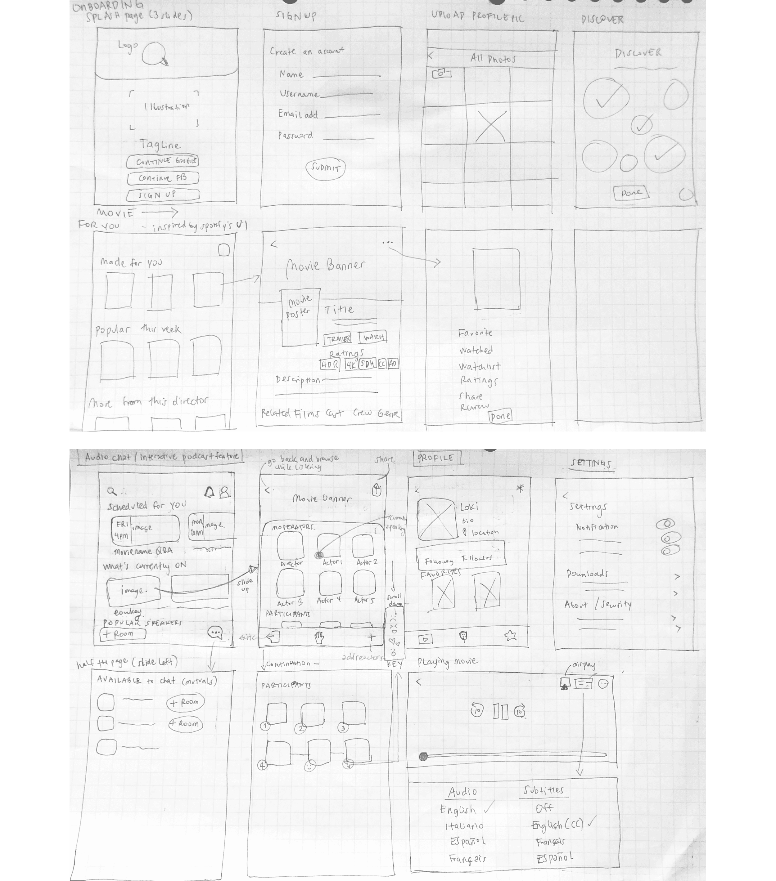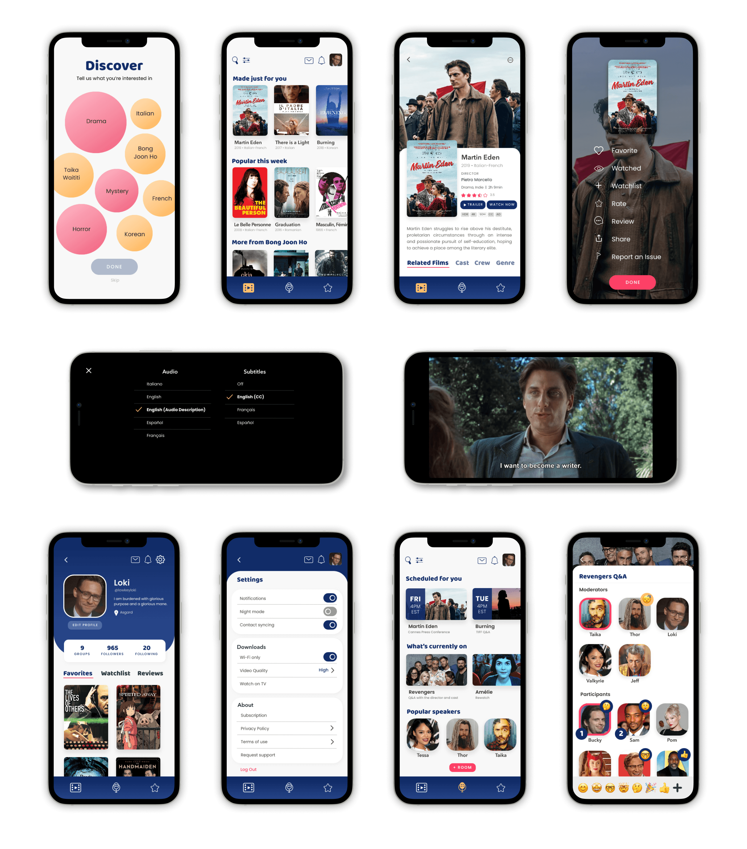 After multiple rounds of iterations and usability testing, I worked on the visual design of the app where I designed the splash, signup screen, discover, movie selections, user profile, CC and SDH options, settings, and audio-chat feature.