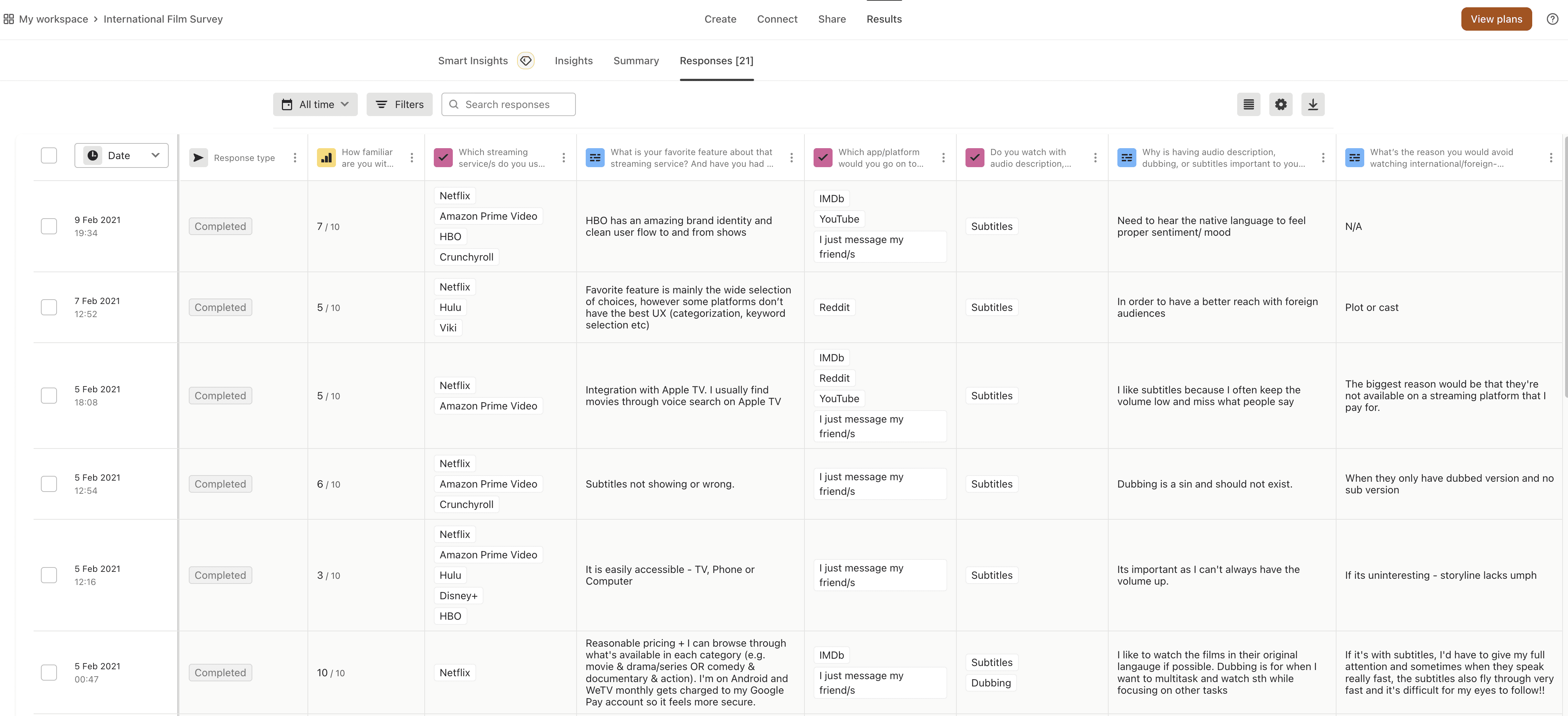 I gathered my data on Typeform where I did a survey with 21 individuals between the ages of 19-54 based on their experience with streaming services and thoughts on international and foreign language films. Here's what I found:
