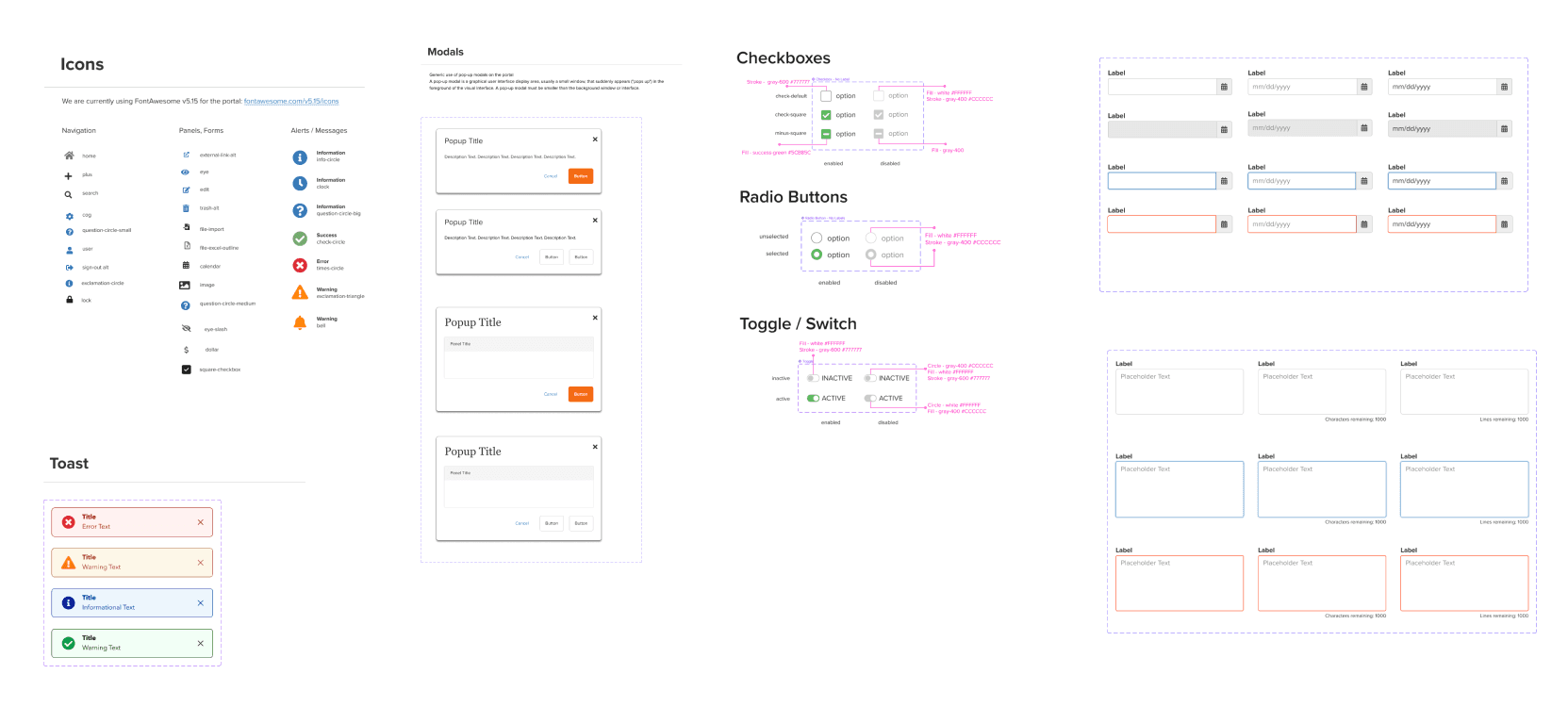 Components - includes foundational and with other components such as checkboxes, radio buttons, toggles, label inputs and outputs, etc.