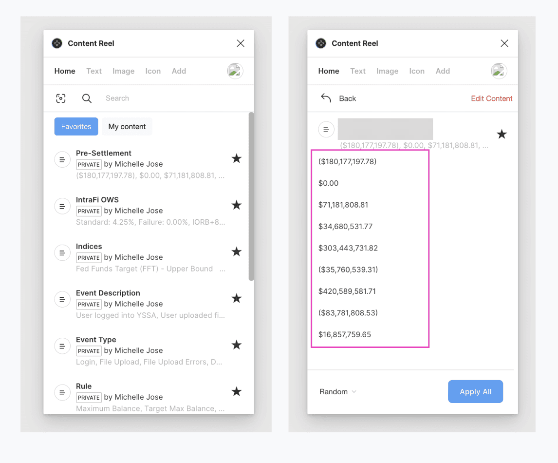 Since we primarily use financial data, it was time-consuming to mock up a page or use Lorem Ipsum as placeholders. While not using real data, we still wanted our mockups to be as realistic as possible when testing prototypes with users. To address this, I explored plugins and discovered Content Reel. For instance, since we use a lot of data tables, I could select entire columns and input placeholder data using this. This plugin helped maximize efficiency and saved us many hours during while designing.