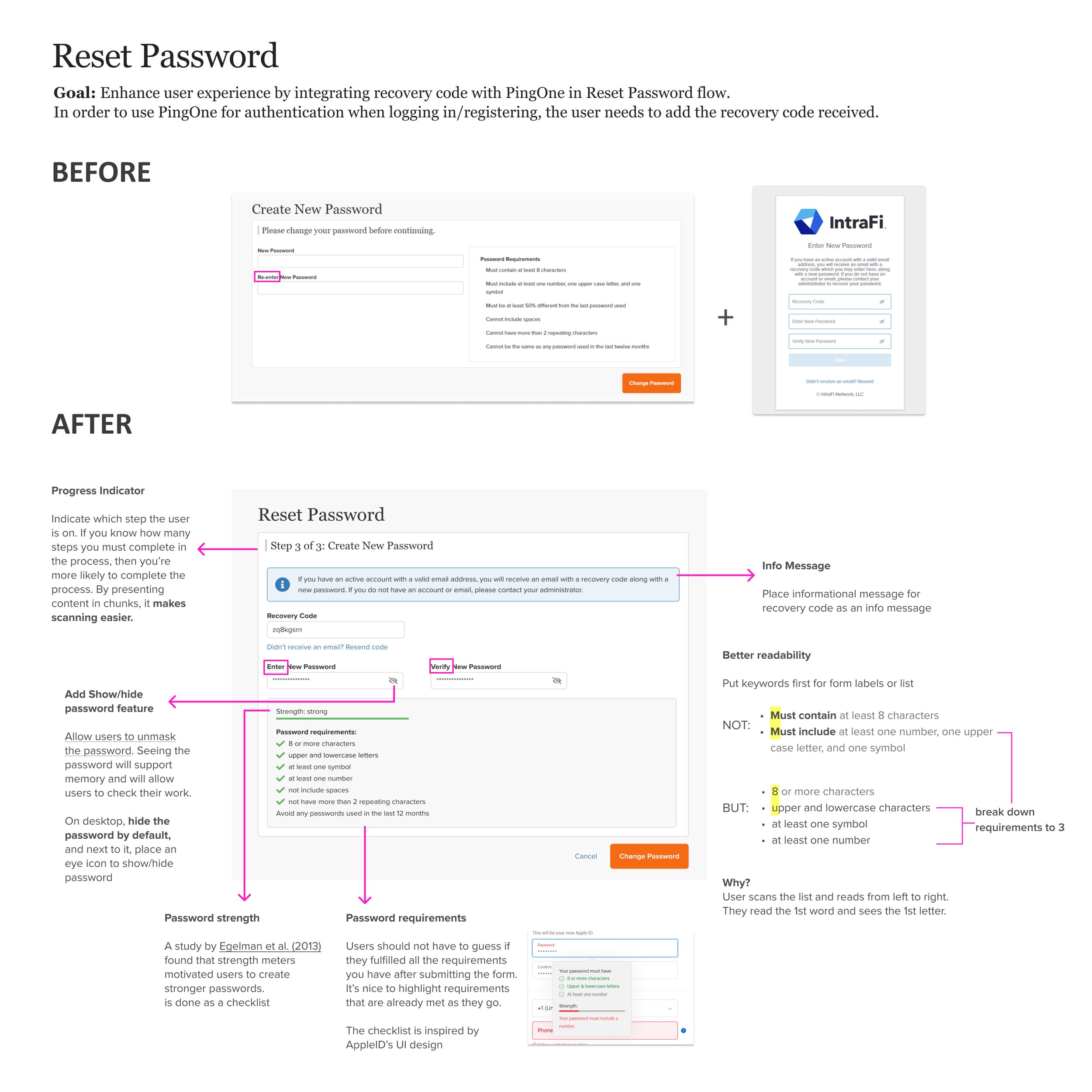 One of the features I enhanced was the password reset user flow. I added a show/hide password icon and the password requirements with a visible checklist.